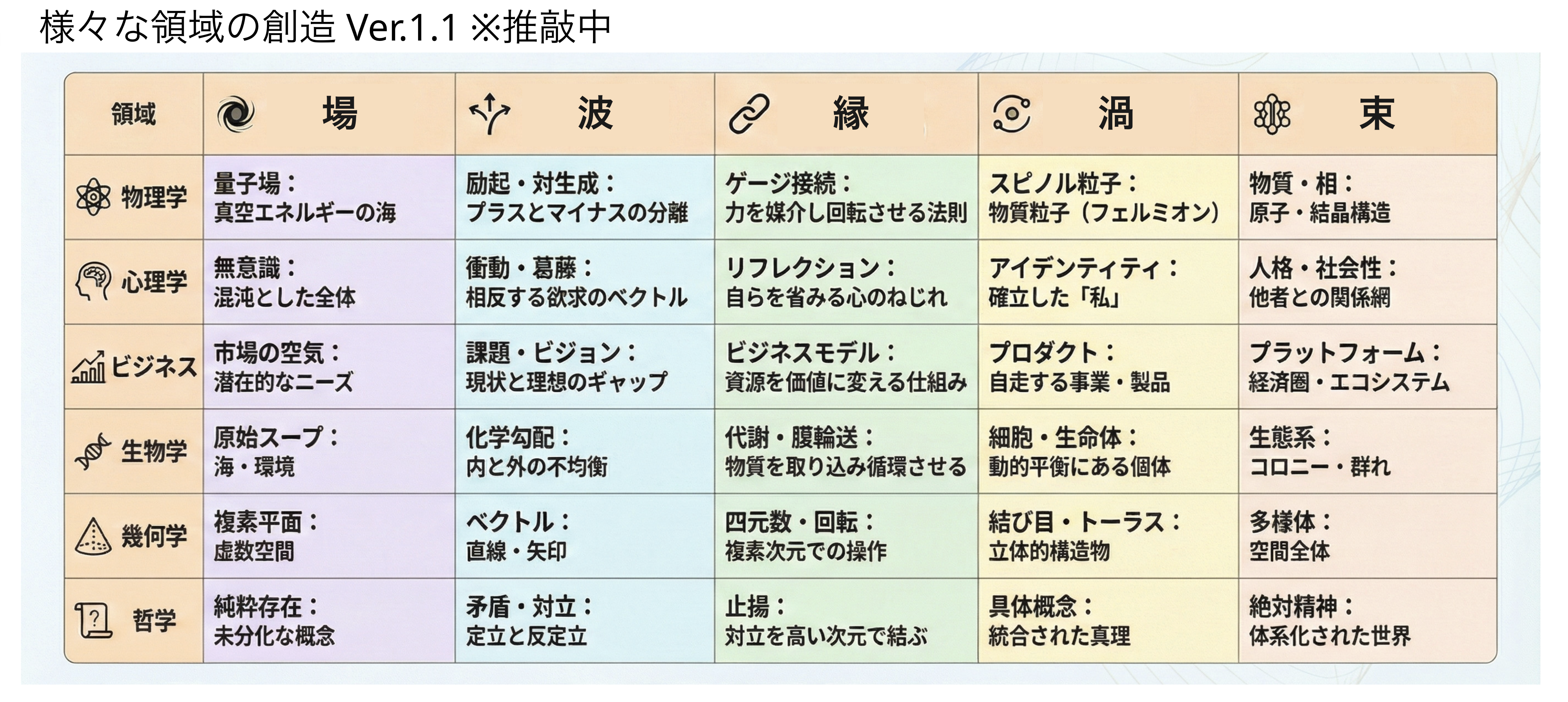 意味もわからぬままお葬式で読んでいた「般若心経」は、束ねていく過程で土台として立ち上がり、最後にQFT(場の量子論)の「実体より生成と関係が先に立つ」という見方に重ねて、構造対応(アナロジー)として照らし合わせてきた、という流れでした。